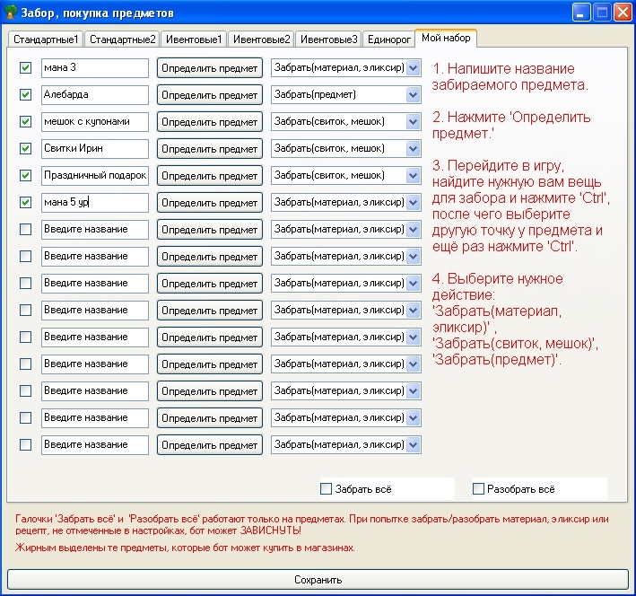 - Теперь вы можете добавить свои предметы для забора, доступно до 15 предметов. Можно забирать как предметы, так и материалы, рецепты, свитки и т.д.