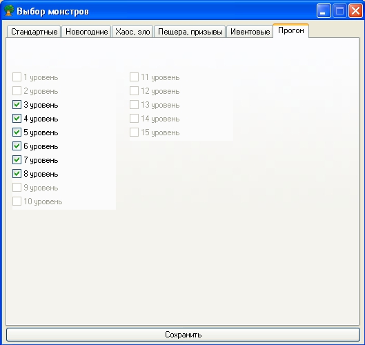 - добавлена возможность прогона монстров (пока доступен прогон монстров 3-8 уровней персонажа, если нужны другие уровни пишите, добавлю).